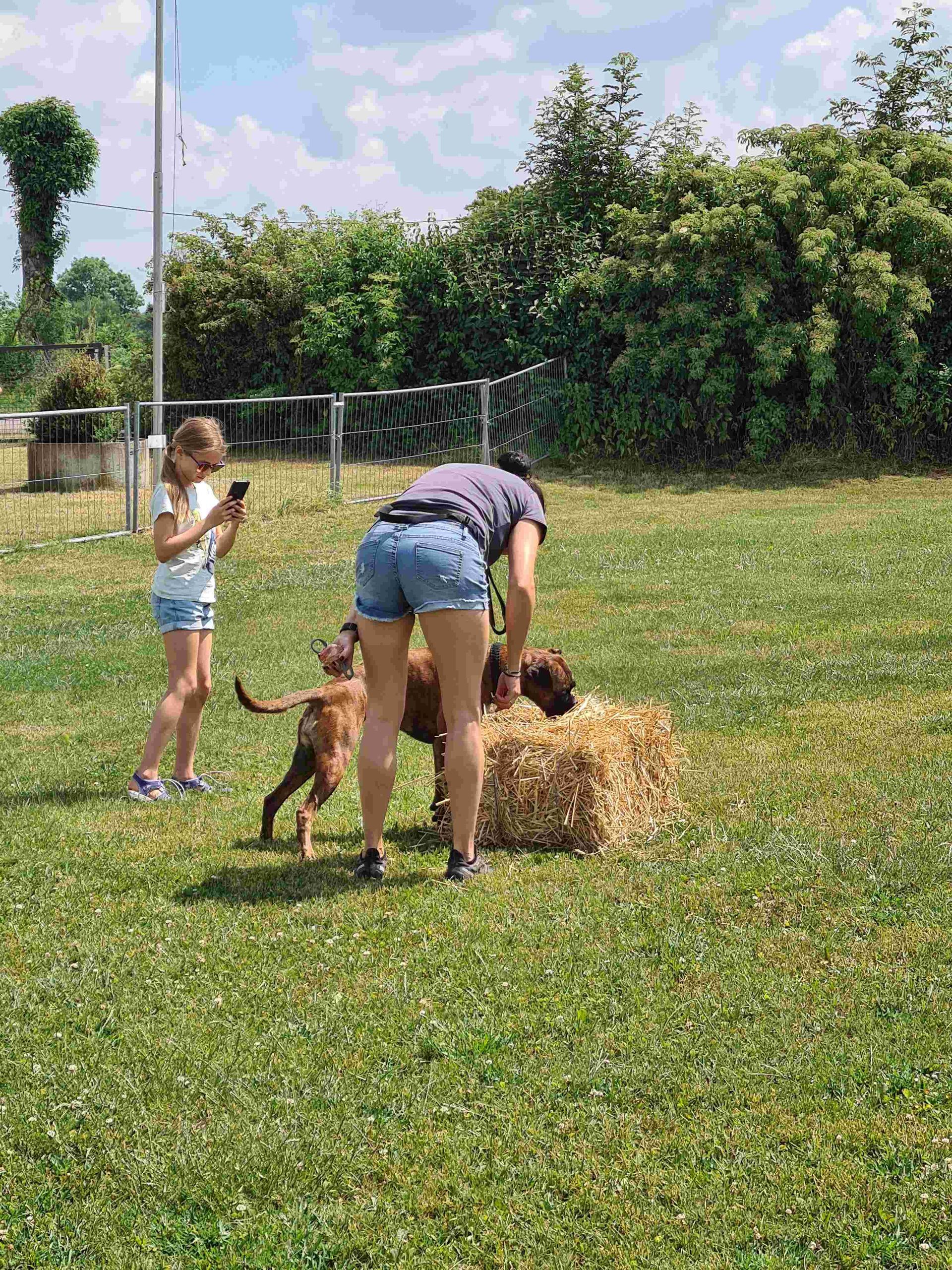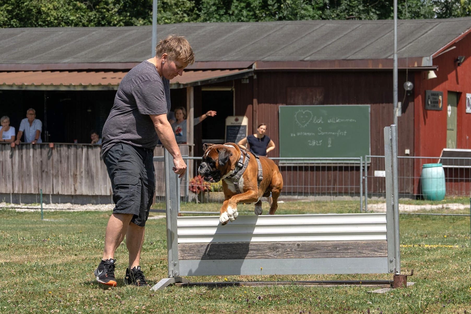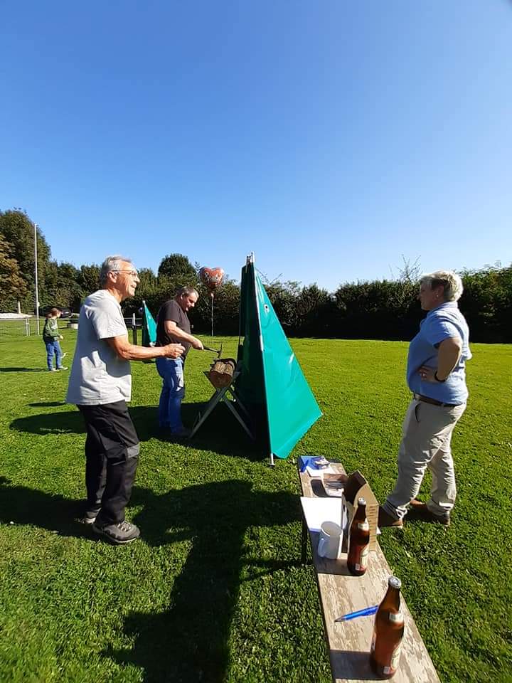 Nach einer ausführlichen Unterweisung zu den wichtigen Verhaltensregeln wegen Corona, stoßen wir (23 Erw. und 8 Kinder) mit Sekt/O-Saft auf unser 1-jähriges Bestehen an. Das Sommerfest begehen wir mit Martinas Überraschungs-Parcours (kleiner Slalom, 2 Hürden, Agility-Tunnel, Wackelteller auf dem der Hund "Sitz" machen soll und am Schluß ein Strohhaufen mit verstecktem Pansen). So viel Spaß macht Hunger - unser Grillmeister Ralf zaubert saftige Steaks, Würste und Grillkäse zu den mitgebrachten mega-leckeren Salaten. Weiteres Highlight für die Kinder ist der Eierlauf mit Hund. Den Tag über verkaufen die Kinder Lose und so können wir uns am Nachmittag auf die schönen Tombola-Geschenke freuen! Bei Kaffee und feinsten Kuchen lassen wir den traumhaften Tag ausklingen.