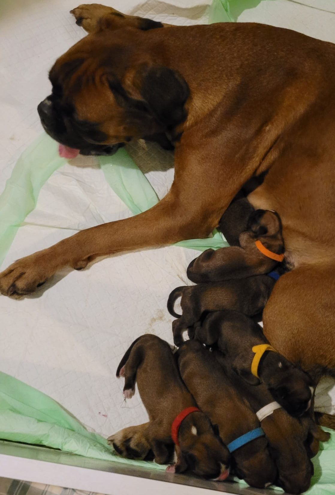 Im Boxerzwinger "von Wilkesland" ist heute der A-Wurf geboren, es sind 5 Buben und 3 Mädels, alle gelb. Der Decktag von Dinka von Gadenweith mit Medicus von Daro war der 10.10.2024. Dinka hat ihren ersten Wurf prima & ohne Hilfe geboren und sie kümmert sich perfekt um ihre Welpen. Dinka und ihren Babys geht es prächtig, alle sind wohlauf. Wir gratulieren zu diesem tollen Wurf und wünschen Uta alles Gute für die Aufzucht. Mehr Infos auf der Züchterwebsite.